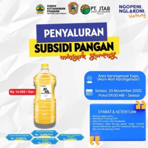 Dinas Ketahanan Pangan Provinsi Jawa Tengah bekerja sama dengan Dinas Pertanian, Pangan dan Perikanan (Dispertan PP) Kabupaten Karanganyar akan melaksanakan penyaluran subsidi pangan berupa minyak goreng bagi masyarakat. Kegiatan ini dijadwalkan pada Selasa, 25 November 2025 mulai pukul 09.00 WIB sampai selesai.